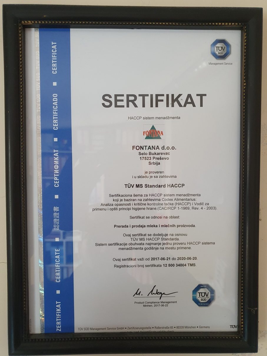 Production at the Fontana milk processing factory takes place under strictly controlled conditions of a closed production cycle that absolutely guarantee correctness and quality. At the beginning of our work, we decided to apply European standards in the organization of production and were certified with HACCP, which guarantees our requirements for high quality. Today, with our professional attitude towards raw milk suppliers, packaging, employees and customers, our factory is established as a leader among small and medium dairies in this part of the region with a tendency to increase it further. production and expand the number of customers.